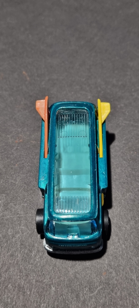 Es erinnert an die frühen, hochdetaillierten Redline-Jahre von Hotwheels. Die Kombination aus metallisch-türkiser Lackierung, klaren Fenstern, heller Inneneinrichtung und den bunten Surfbrettern machen den Bus zu einem echten Blickfang in jeder Vitrine.