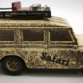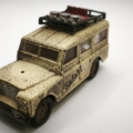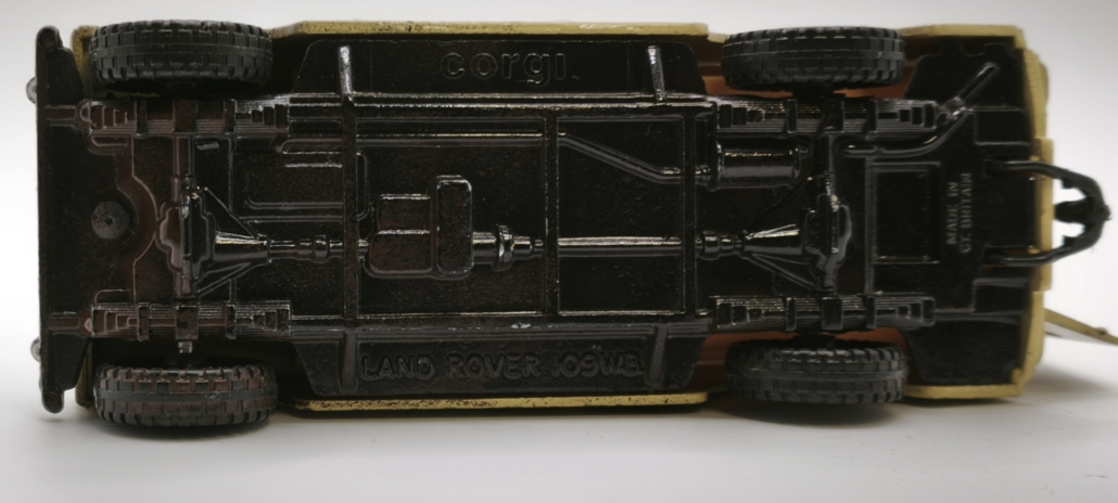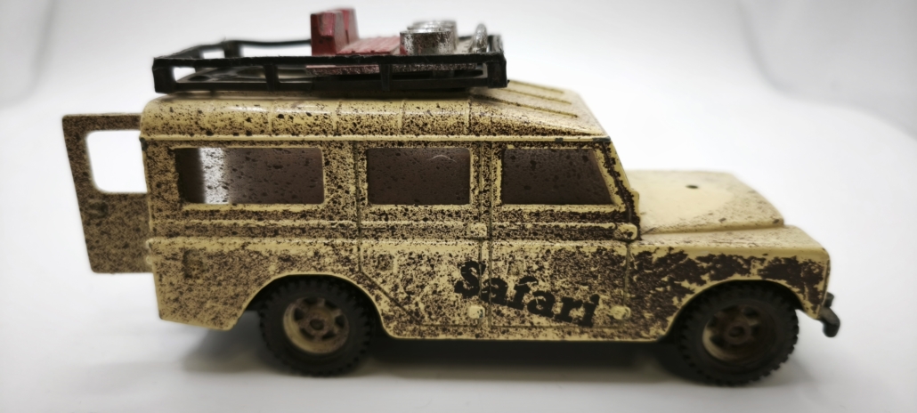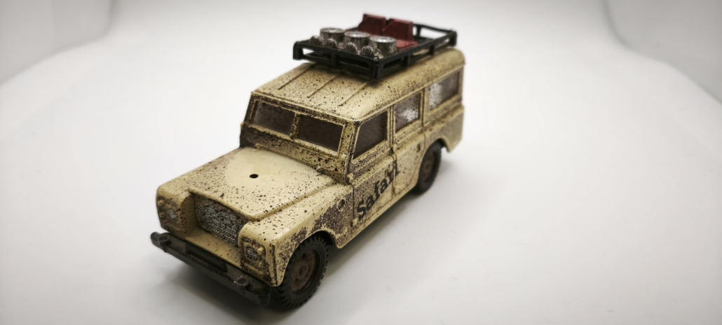 Der original Corgi 619 Land Rover 109 WB aus dem Jahr 1985. Dieses Modell ist eine gesuchte Safari-Variante mit der speziellen gesprenkelten Lackierung (“Splatter-Paint”).