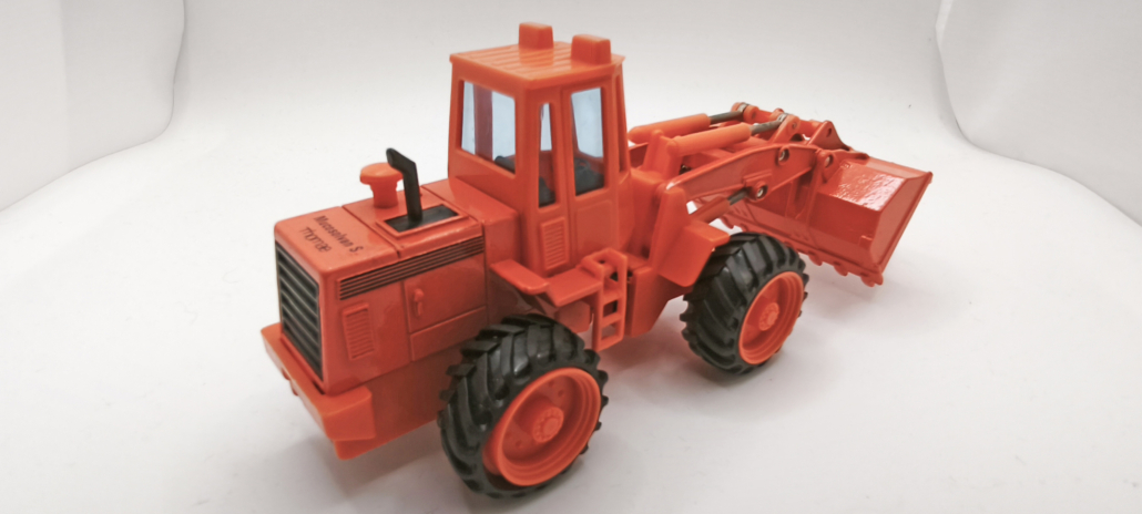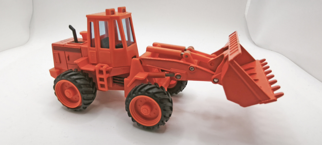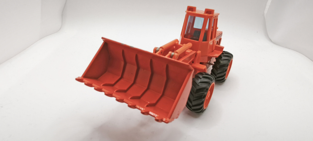 Das Modell kombiniert hochwertigen Kunststoff mit Metall-Gussteilen (Diecast). Metallteile: Schaufel, Teile der Hydraulik, der Motorblock und andere Elemente. Kunststoffteile: Kabine, Räder